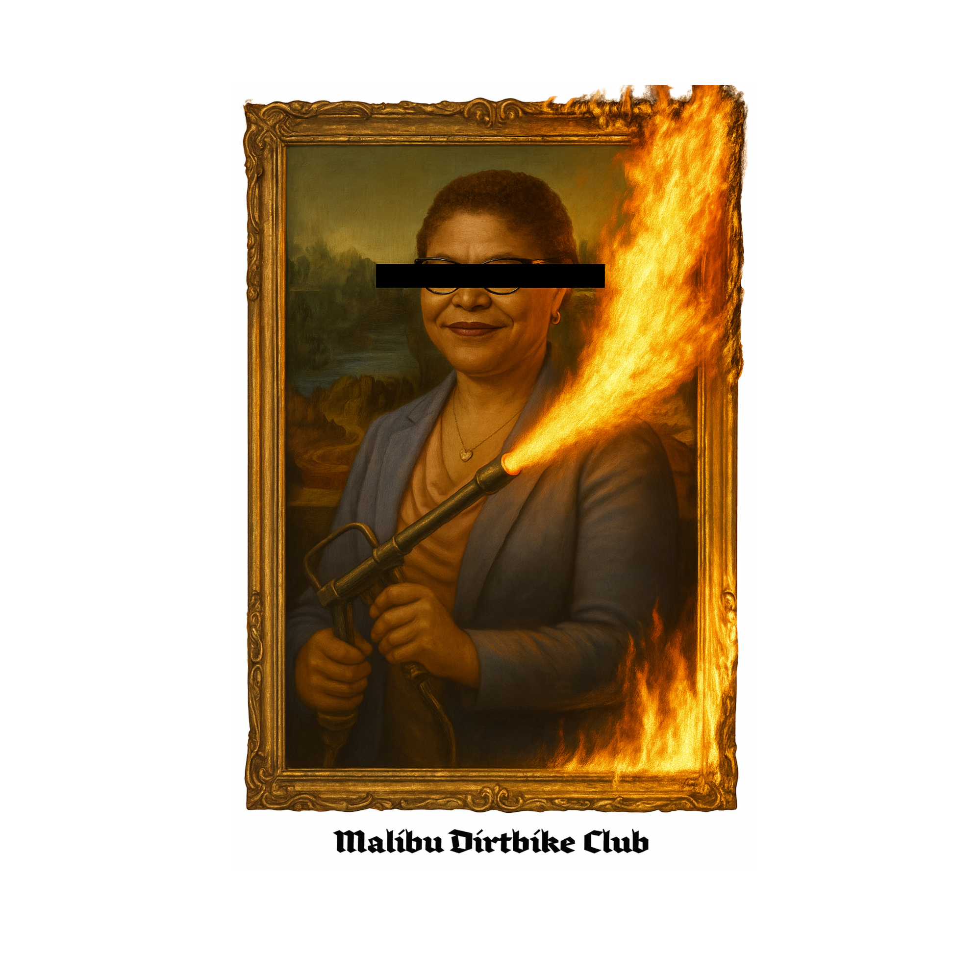 Depicts Karen Bass as the Mona Lisa, holding a flame thrower, eyes blurred out, and in a wooden frame.